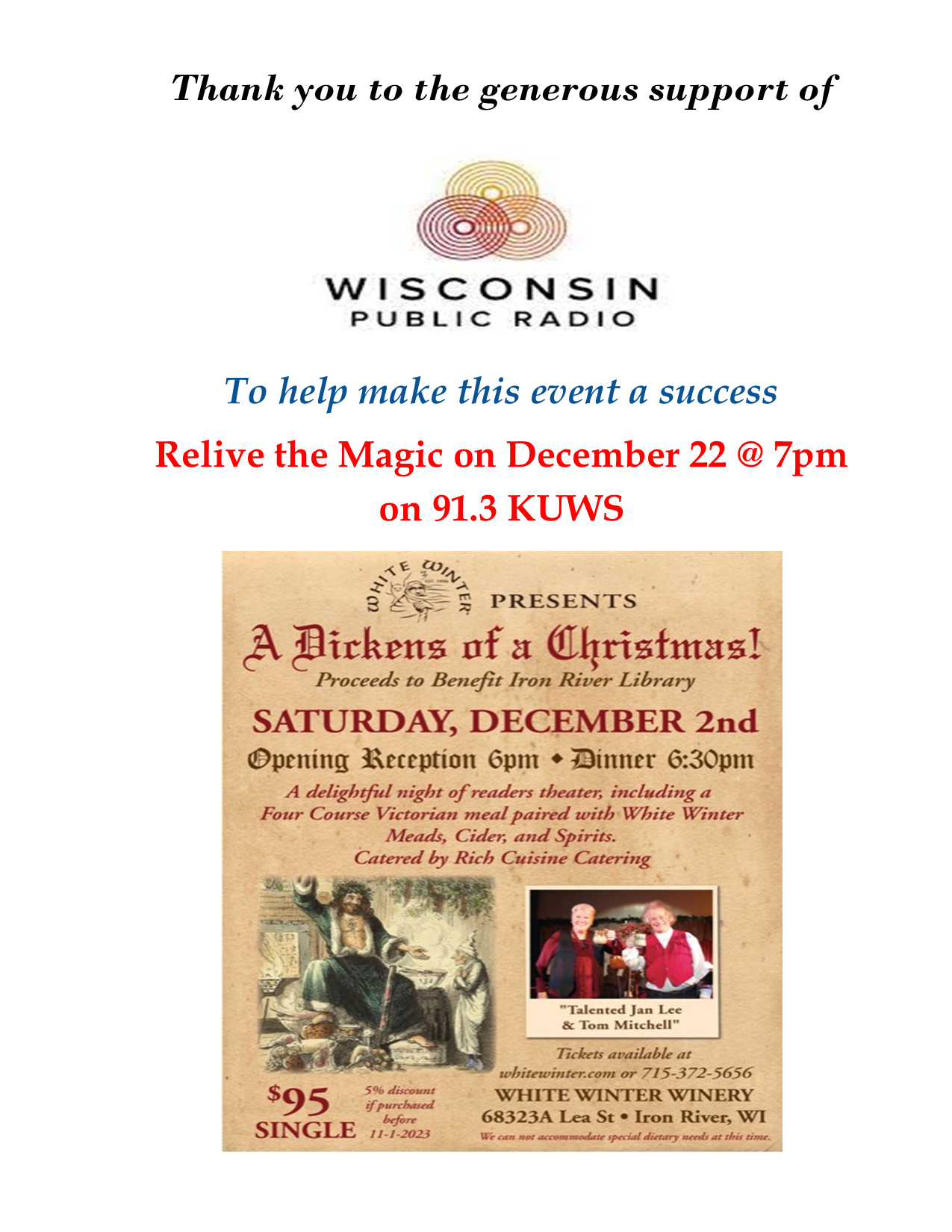 Wisconsin Public Radio - "A dickens of a christmas" Friday, December 22, 2023 7:00 PM 8:00 PM 19:00 20:00 Iron River Public Library 68235 South Main Street Iron River, WI, 54847 United States (map) Google Calendar ICS