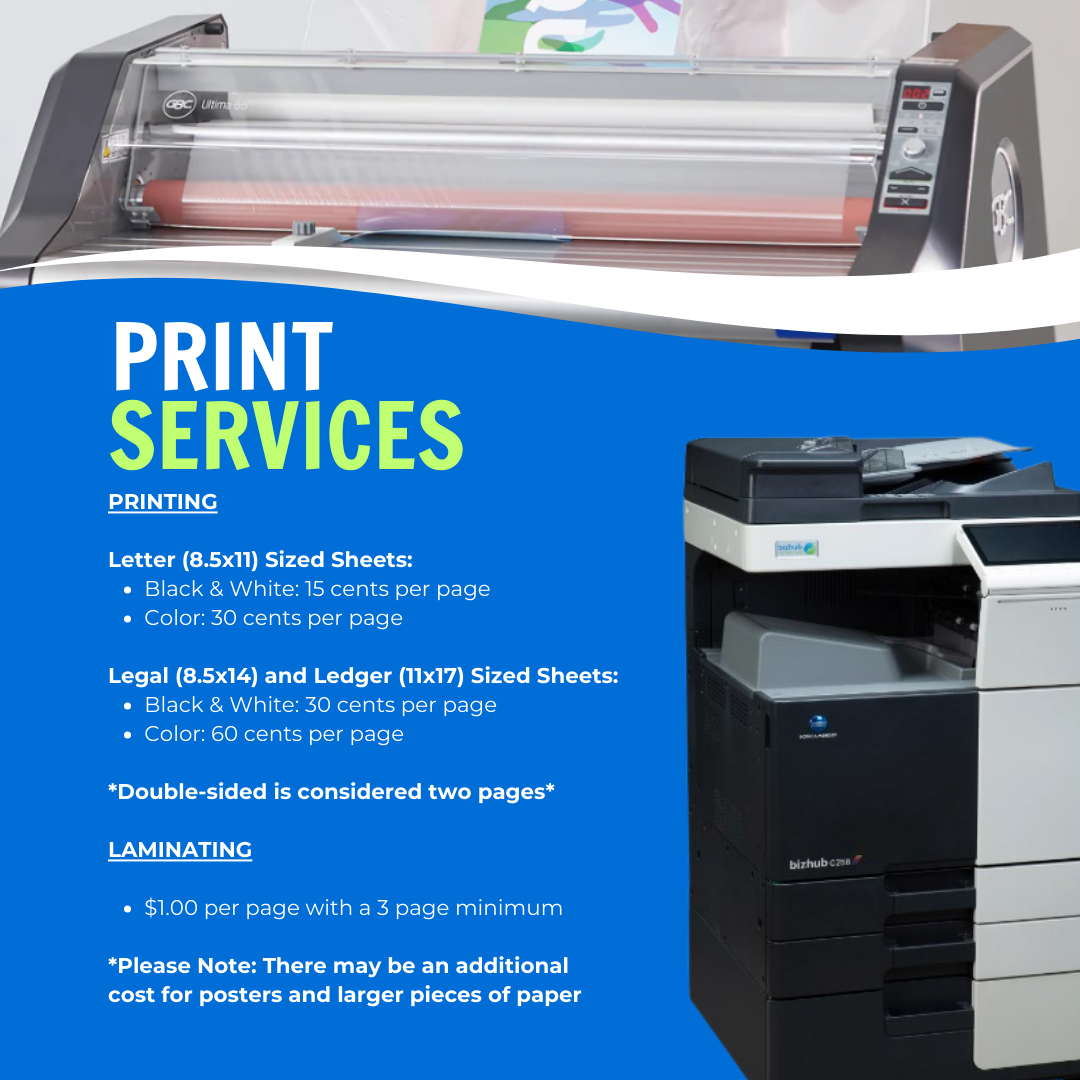 Copy Machine & Printing - 15¢ per black & white page, 30¢ per color page (for 8.5 x 11 sheets).